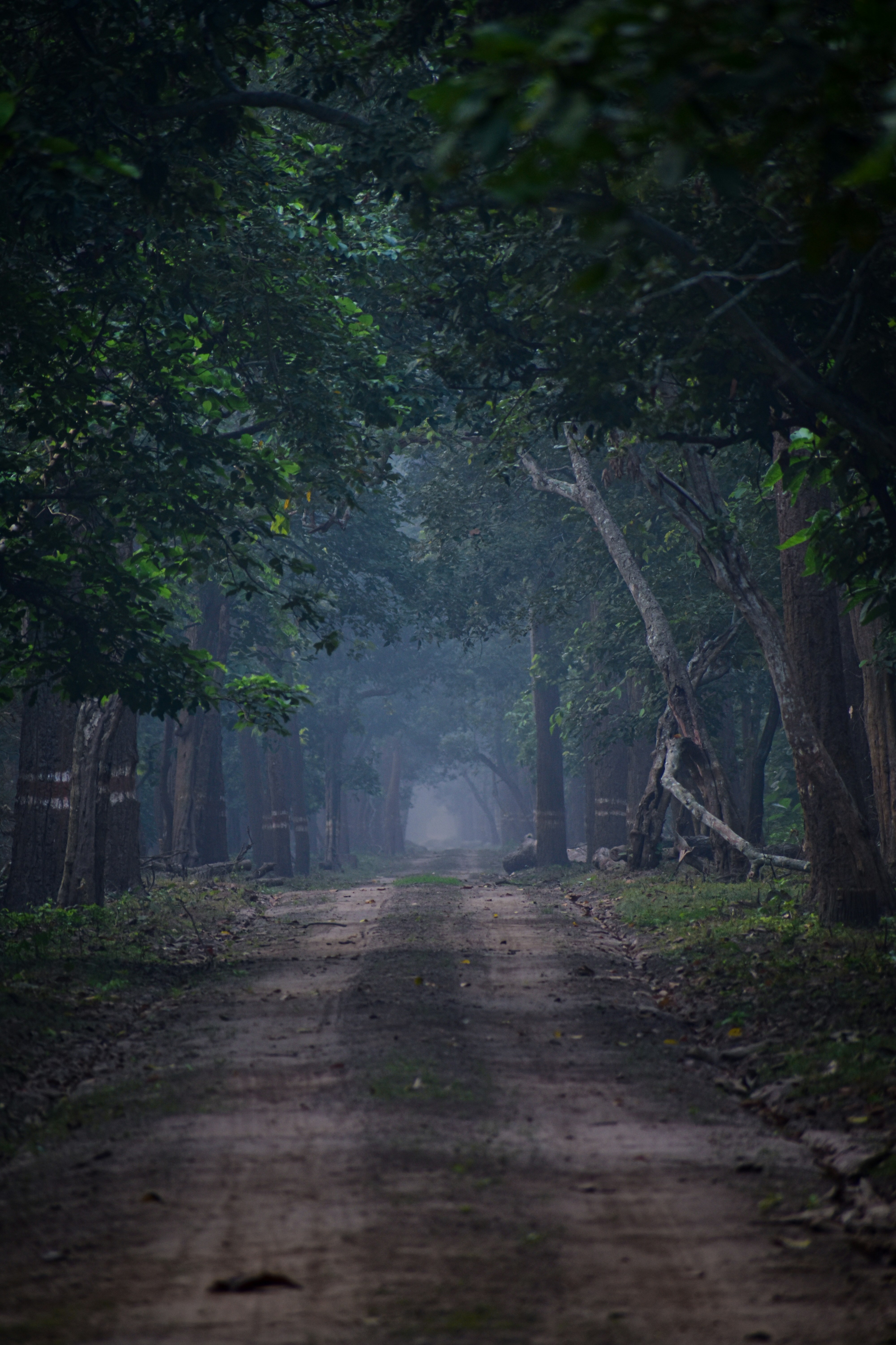 ahead is just tall skinny trees misted with fog.